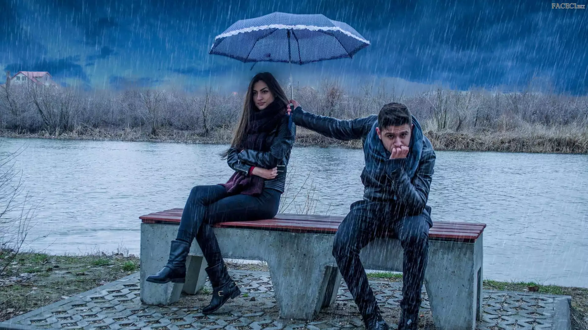 Ławka, Parasol, Mężczyzna, Kobieta, Deszcz - faceci.biz